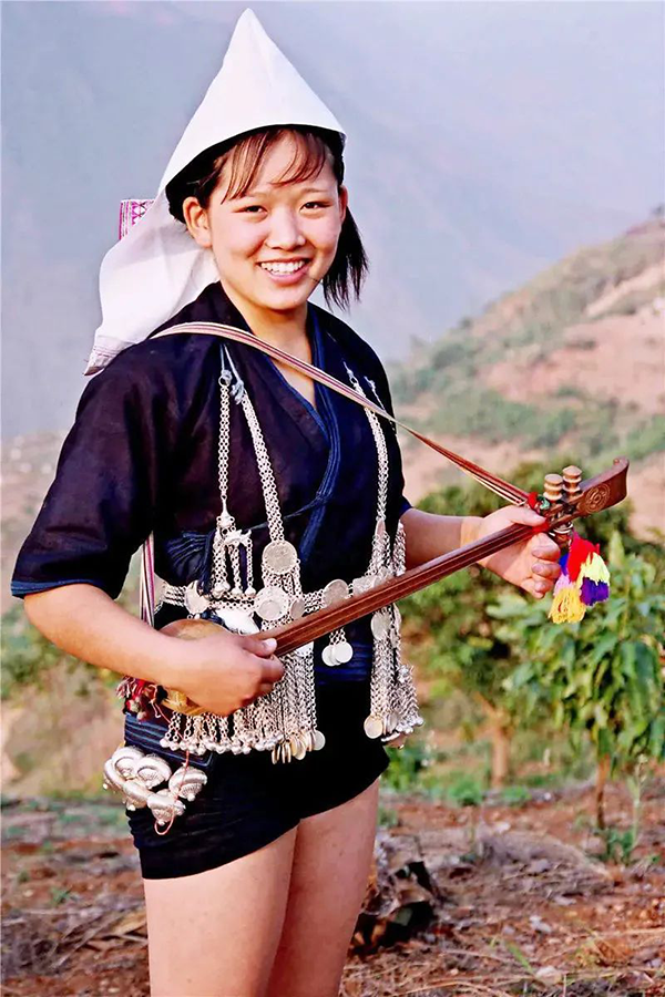 紅河縣哈尼族奕車支系獨有的“奕車服飾”至今已有千余年的歷史?!稗溶嚪棥碧攸c是緊臀、超短、露臍、無褲腰。以黑白相配為主調,對比強烈、白色的帽子、銀飾,黑色的衣服、褲子,一眼望去極為醒目,充分體現了哈尼族奕車人簡潔、熱情奔放的民族個性特征。