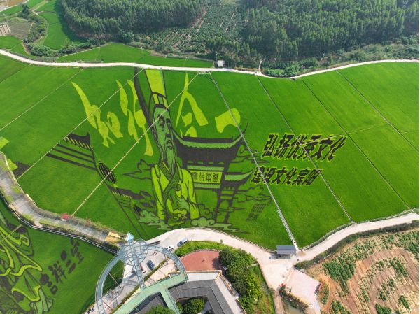 近期,大陸村稻田藝術景區迎來了一批又一批游客。站在觀景臺上俯瞰,右邊稻田藝術畫的主題是“文化賓陽”,一幅巨大的明朝思想家王陽明像映入眼簾,身后則是“賓州南街”以及“知行合一”四個大字, 展現了賓陽五大文化中的陽明文化與古城文化。左邊有兩幅稻田藝術畫,一幅是“如虎添翼”,一只憨萌可愛的小老虎背著一雙翅膀,寓意大陸村村民祝愿游客“凡事都能如虎添翼”;另一幅是“吉祥三寶”,畫面上是烤著串的牛魔王、拿著手機自拍的鐵扇公主和忙著給爐子添火的紅孩兒,趣味橫生,這是對“西游”文化的一種趣味解構。