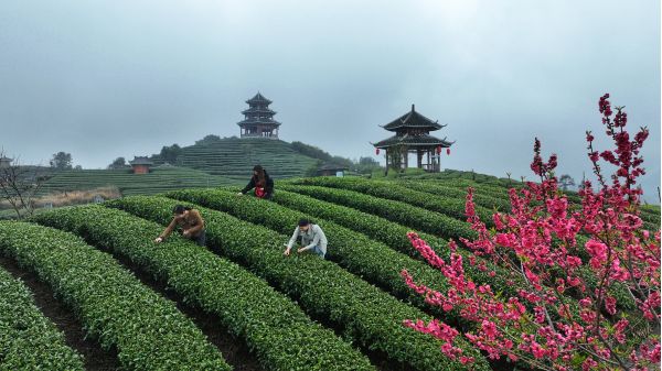 春暖花開,萬物復蘇。近日,廣西三江侗族自治縣八江鎮布央村仙人山茶園內桃花迎春怒放,春茶初露嫩芽,游客愜意采摘,與山上的特色廊亭、縹緲云霧相互映襯,構成一幅迷人的春景圖。