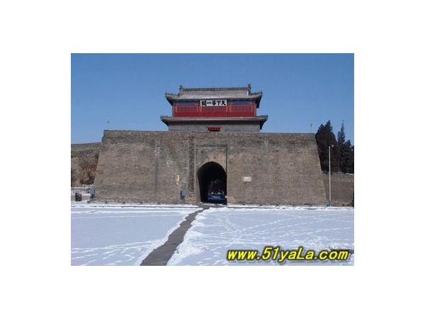 山海關城是一座土筑磚包的雄偉關城,城高14米,厚7米,周長4公里,呈正方形。整個城池與萬里長城相連,以城為關。城有四門:東曰鎮東即天下第一關;西曰迎恩;南曰望洋;北曰威遠。登上山海關城樓北望,萬山重疊,長城蜿蜒,景色壯觀。南望為“老龍頭”的寧海城,內有澄海樓,稍北為南翼城。關城很堅固,東門除了建有甕城外,東門箭樓兩側還筑有臨閭樓、威遠堂、牧營樓和靖邊樓。城北還筑有北翼城,以駐兵防守和儲備糧草。為防衛的需要,城關周圍還筑有眾多的城堡和星羅棋布的敵臺、烽火臺,這樣就形成了以長城為骨干,以“天下第一關”為中心,主體兩翼、左輔右弼、前防后衛的古代城防體系。