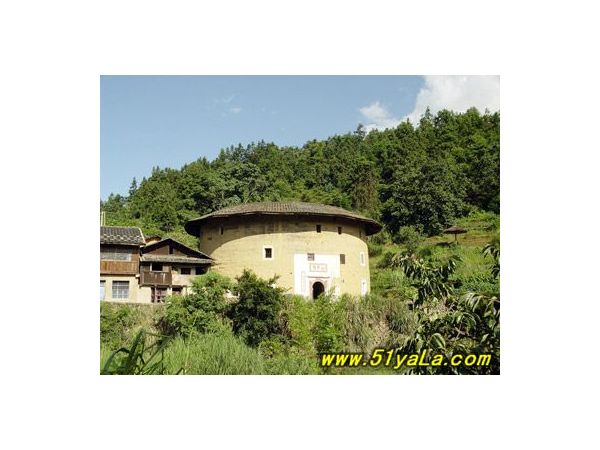 永定土樓分方形土樓和圓形土樓。永定全縣有圓樓360座,方樓4000余座。圓形土樓(又稱圓寨)是客家民居的典范,圓樓大都由二、三圈組成, 由內(nèi)到外,環(huán)環(huán)相套。外圈高十余米,一般高三至四層,有一、二百個(gè)房間。一層是廚房和餐房,二層是倉(cāng)庫(kù),三、四層是臥室;二圈兩層,有三十至五十個(gè)房間,一般是客房。中間是祖堂,是居住在樓里幾百人婚喪喜慶的公共場(chǎng)所。樓內(nèi)還有水井、浴室、磨房等設(shè)施。土樓采用當(dāng)?shù)厣梁恢恍杞z毫鋼筋水泥,墻的基礎(chǔ)寬達(dá)三米,可行汽車,底層墻厚1.5米可橫臥人,向上依次縮小,頂層墻厚也不小于0.9米。沿圓形墻用木板分割成眾多的房間,其內(nèi)側(cè)為走廊。