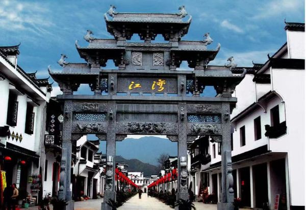 山環水繞的江灣鎮自然風景格外秀美,整個村子布局規整,一街六巷,縱橫交錯。主街入口佇立著高大巍峨的牌坊,牌坊后的樹木如士兵般列隊整齊,走在街上,古樸優雅,自成一景。