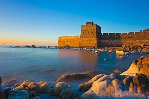 山海關位于秦皇島市山海關區,景區內名勝古跡薈萃、風光旖旎、氣候宜人,區內有開發和觀賞價值的名勝古跡達90多處,有老龍頭、孟姜女廟、角山、天下第一關、長壽山、燕塞湖六大風景區,是著名的歷史文化古城和旅游避暑勝地。其中,老龍頭景區總占地面積700畝,由入海石城、海神廟、靖鹵臺、南海口、澄海樓、寧海城和濱海長城七部分組成。澄海樓是老龍頭的制高點,是觀海的勝地。地址:河北省秦皇島市山海關區
