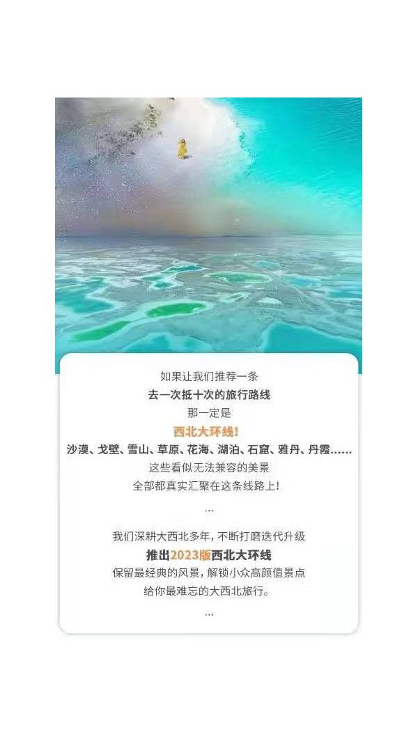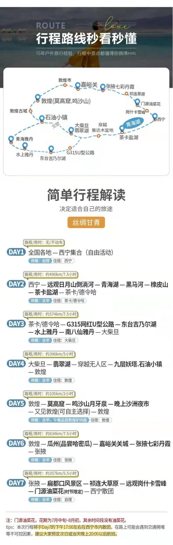 請對應(yīng)使用我方玩聚甘青夢境小團(tuán)7日行程,因使用其它行程造成的投訴,責(zé)任自負(fù);請仔細(xì)閱讀以上行程文檔,同意并保證遵守我方安排,以免為您帶來不必要的麻煩;如產(chǎn)生合同糾紛或人身意外事故,按《中華人民共和國合同法》、《道路交通法》、《保險(xiǎn)賠償條例》裁定;本行程作為旅游合同附頁與旅游合同同等法律效力。