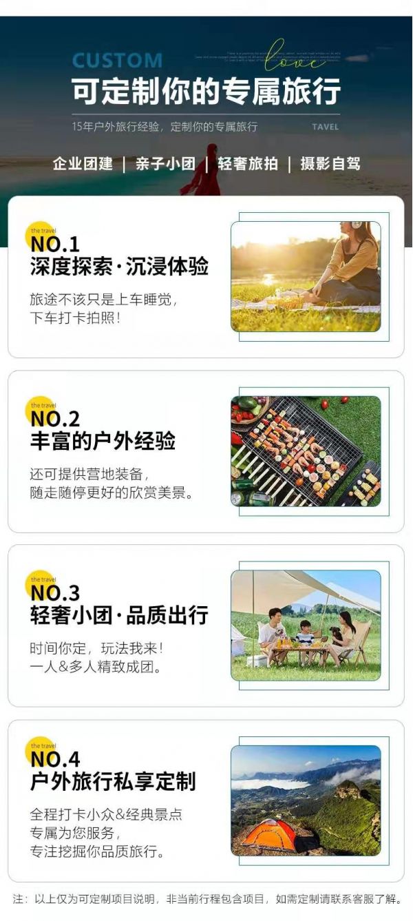 4、如途中遇不可抗因素(如修路、塌方、車輛事故阻礙等)或時(shí)間天氣變化我方有權(quán)根據(jù)情況調(diào)整行程線路走向,此舉均是根據(jù)帶隊(duì)經(jīng)驗(yàn)為大家更順利的游玩而做出的改變,希望大家理解和支持,但如造成額外費(fèi)用由客人自理,望您諒解;若對行程造成影響的,我方將全力協(xié)助游客進(jìn)行解決,但不承擔(dān)由此造成的損失,若因此而增加的費(fèi)用,敬請游客自理。