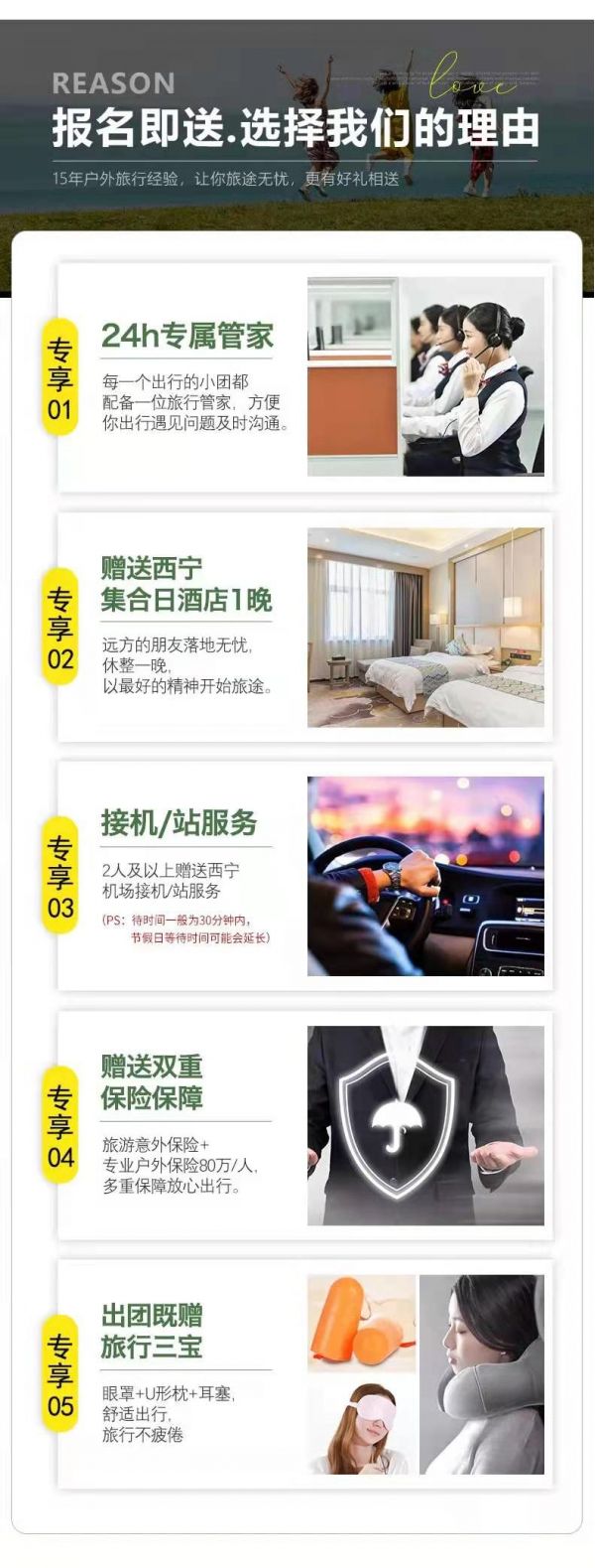本次活動提供西寧市內(nèi)24小時(shí)接機(jī)/接站服務(wù),工作人員會在您出發(fā)日期前一天21:30之前向您推送消息并與您聯(lián)系,如果超過時(shí)間沒有接到任何通知,請及時(shí)與報(bào)名處聯(lián)系。(接站等待時(shí)間一般為15-20分鐘,最長不超30分鐘,節(jié)假日拼單人數(shù)較多情況下客人等待時(shí)間可能會延長)。