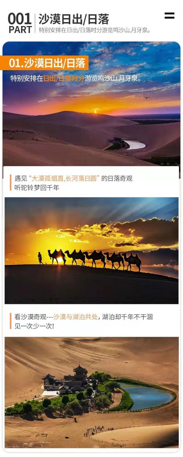 下午:去鳴沙山【月牙泉】。鳴沙山山體由細(xì)米粒狀黃沙積聚而成,狂風(fēng)起時(shí),沙山會發(fā)出巨大的響聲,輕風(fēng)吹拂時(shí),又似管弦絲竹,而得名為鳴沙山;月牙泉被鳴沙山環(huán)抱,長約150米、寬約50米,因水面酷似一彎新月而得名,月牙泉邊現(xiàn)已建起了亭臺樓榭,再加上起伏的沙山、清澈的泉水、燦爛的夕陽、景致相當(dāng)不錯,在此可自費(fèi)騎乘駱駝、滑沙,或參加各種沙漠娛樂項(xiàng)目。