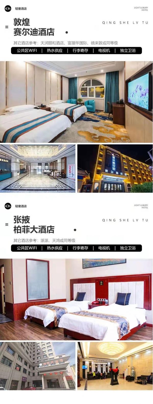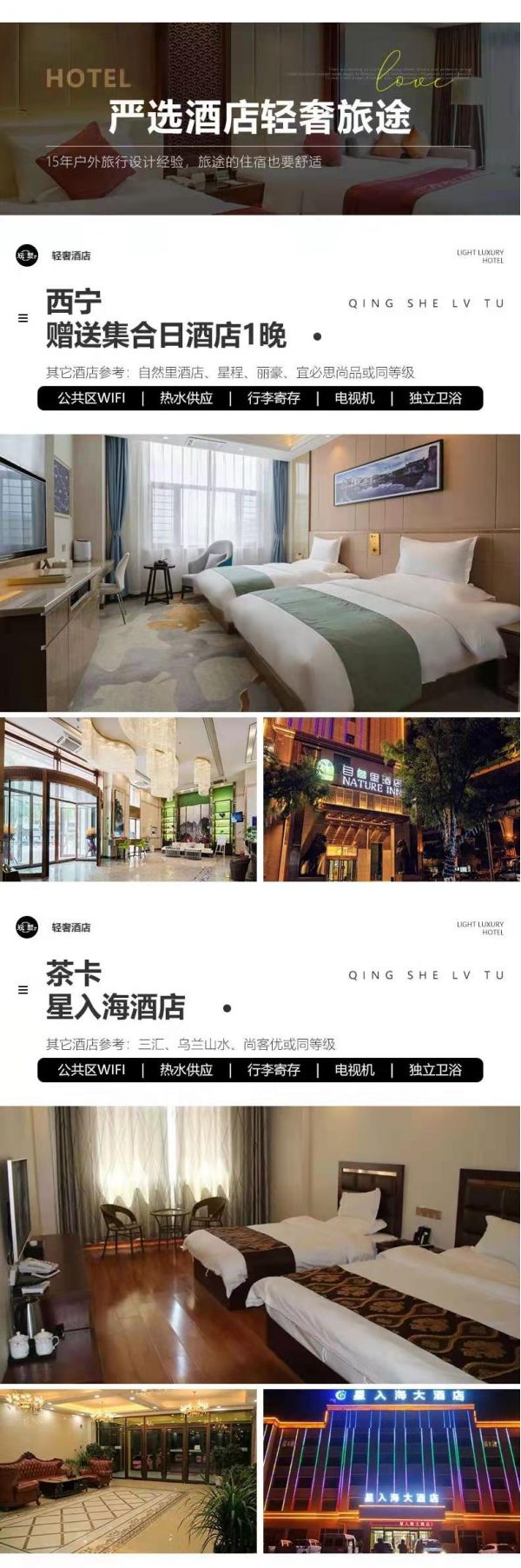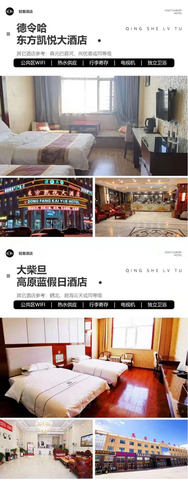 住宿:行程所列6晚住宿。我們會提供行程內(nèi)展示照片的酒店或其他條件相似酒店,但因沿途條件有限,如酒店設(shè)施達(dá)不到您的期望,請您諒解。西寧:自然里酒店、星程、麗豪、宜必思尚品或其它同級酒店德令哈:柏菲大酒店、派派、天鴻或其它同級酒店大柴旦:高原藍(lán)假日酒店、曬北、碧海云天或其它同級酒店茶卡:星入海、三匯、烏蘭山水、尚客優(yōu)或其它同級酒店敦煌:賽爾迪酒店、天潤頤和酒店、富麗華國際、禧來敦或其它同級酒店張掖:柏菲大酒店、派派、天鴻或其它同級酒店服務(wù):由經(jīng)驗(yàn)豐富的司機(jī)提供向?qū)Х?wù),司機(jī)非導(dǎo)游,不進(jìn)景區(qū),敬請諒解。