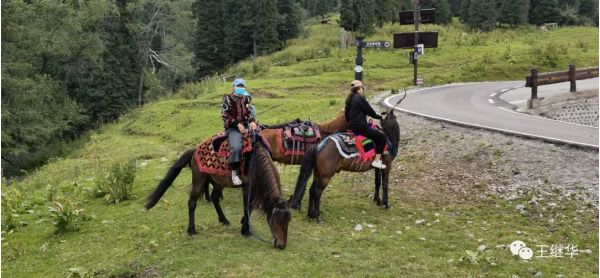 有一個在此休息的導游告訴我們山頂上漂亮可以到山頂上去放無人機,。到山頂有電瓶車票價120。我們6個人包了一輛車,司機叫老張,中等個風吹日曬的黑臉布滿了皺褶。他很熱情主動的介紹山上的情況,開車的時候主動問我們新疆第一大民族是什么民族,我們說是哈薩克,他在前面開著車說:錯。是維族,他又問第二大民族是什么,我們說哈薩克,他得意的說:還是錯,是漢族。他又問第三大民族是什么,我們說哈薩克,他說對了。他又問,你知道那拉提是什么意思,我們說不知道,他說哈薩克語是太陽升起的地方。老張接著自我介紹他也是一個漢族,今年59歲,家在100公里外的公留縣,老婆是一個教師,很漂亮。開私家車來這上班,宿舍就在山下公司宿舍。和山上氈房里的哈薩克牧民都非常熟悉。言語之間露出一些自豪。