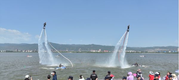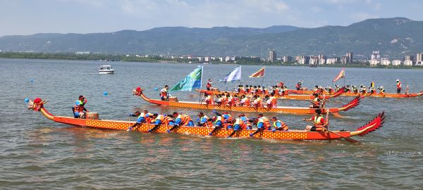 當(dāng)日上午,天氣晴朗,晉陽湖碧波蕩漾,精彩的水上飛人表演吸引了許多游客觀看。岸上鼓聲陣陣,精彩的舞龍表演引來陣陣掌聲。伴隨著熱鬧的鑼鼓聲,4條龍舟“披紅點睛”禮成后下水巡湖,拉開了晉陽湖首屆龍舟競賽的序幕。據(jù)介紹,從6月23日開始,8組來自晉源各鎮(zhèn)(街)的龍舟代表隊和17組企業(yè)龍舟代表隊將在晉陽湖公園東岸觀湖長廊飛舟競渡,展示歷史與現(xiàn)代交融、傳統(tǒng)與潮流并匯的城市氣息。