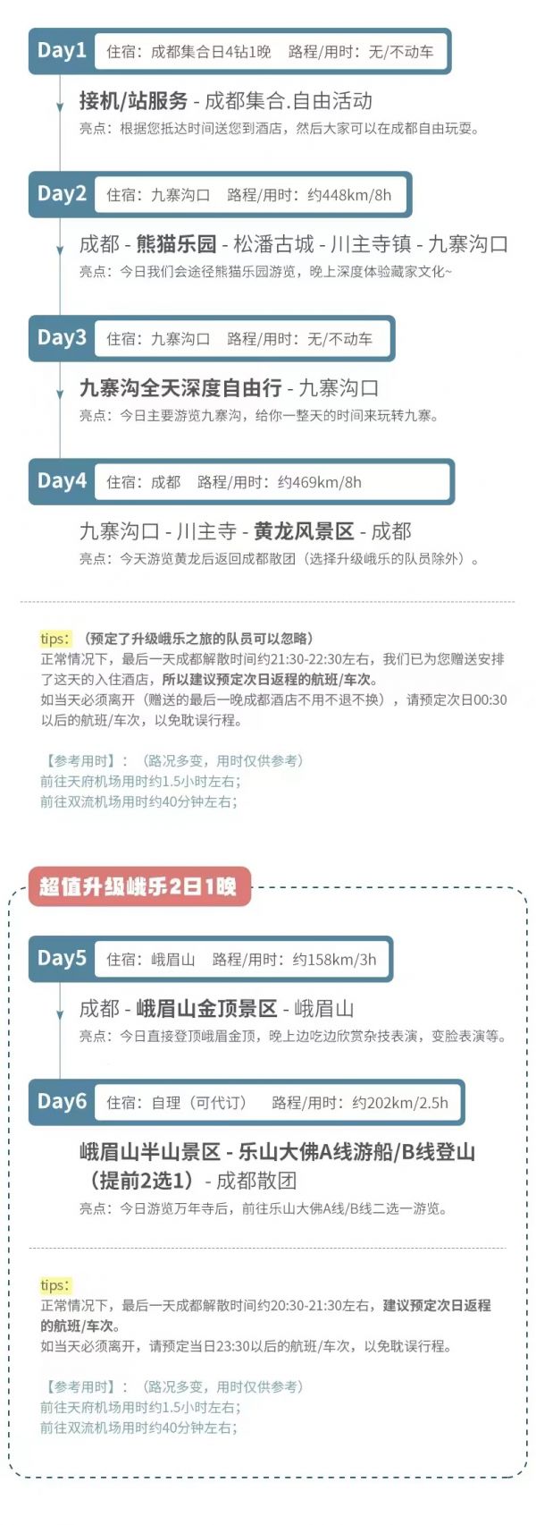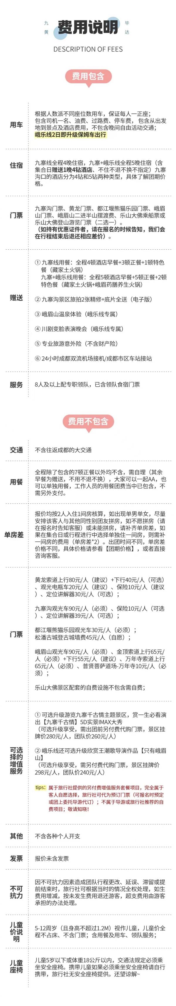 3、當天返回成都時間約在下午的21:30左右,由于不能預估有可能堵車等不可抗力因素情況,建議客人不要預定當天返程的火車或是飛機,以免因為堵車給您帶來沒有必要的損失。若因自行預定當天大交通造成延誤的,我社不賠償任何費用,不承擔任何責任!敬請知曉。