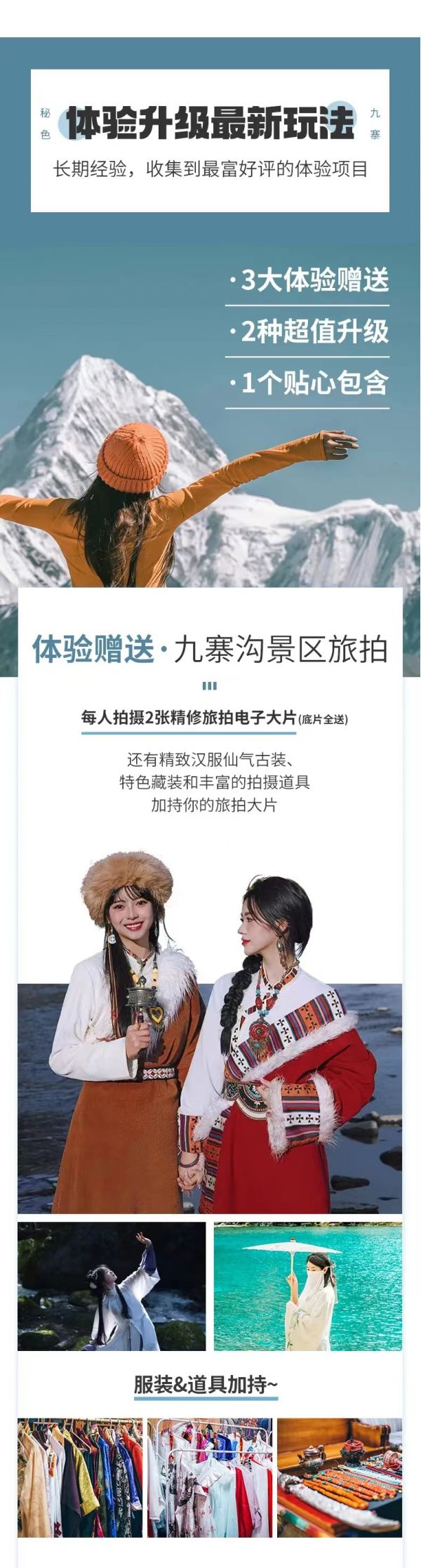 隨著季節的變化,九寨溝也呈現出不一樣的風姿;深秋的九寨溝享譽世界,只見漸次經霜的彩林深淺相間、錯落有致,是“萬山紅遍,層林盡染”的最佳寫照,在漫山遍野濃烈的紅襯托之下,碧水更綠、藍天更藍,呈現出光怪陸離的水景;待入冬,莽莽林海都覆上皚皚白雪,林海雪原似玉樹瓊花,潔白、高雅,是觀賞九寨六絕之“藍冰”和“雪峰”的最好時機。也因這不二的美,這里也是許多熱門影視劇里的取景場地,今天我們就在這個大小熒屏收錄過的仙境來一場旅拍,由專業駐地攝影師為大家拍攝漢服/藏裝旅拍大片,每人2張精修電子照、底片全送,定格住旅程最美的瞬間。