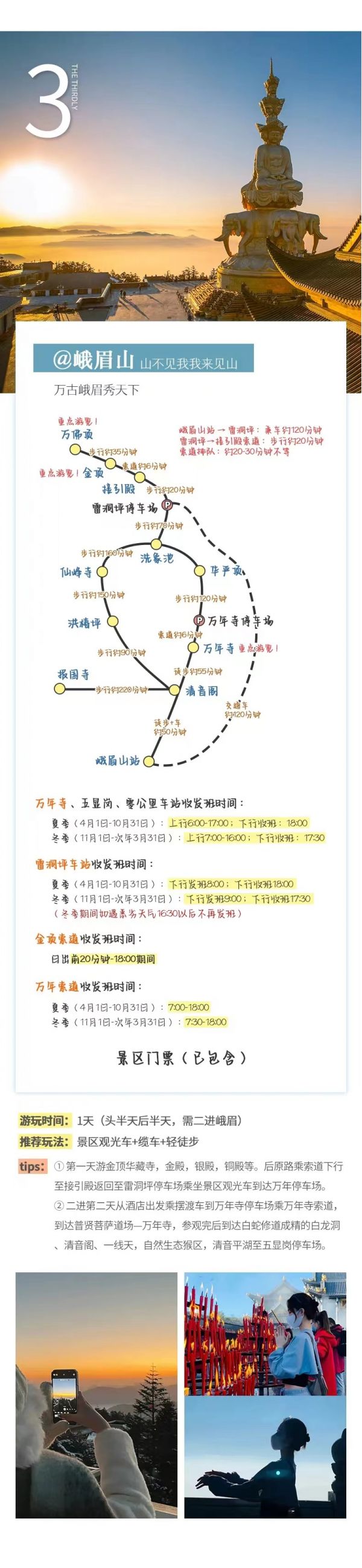 【金頂】,游金頂華藏寺,金殿,銀殿,銅殿,大型觀景臺等,觀世界最高佛教朝拜中心,登攝身崖,俯視川西平原的優美風光,充分感受峨眉“雄,秀,奇,險,幽”的五大特色。然后原路乘索道下行至接引殿返回至雷洞坪停車場乘坐景區觀光車到達萬年停車場。