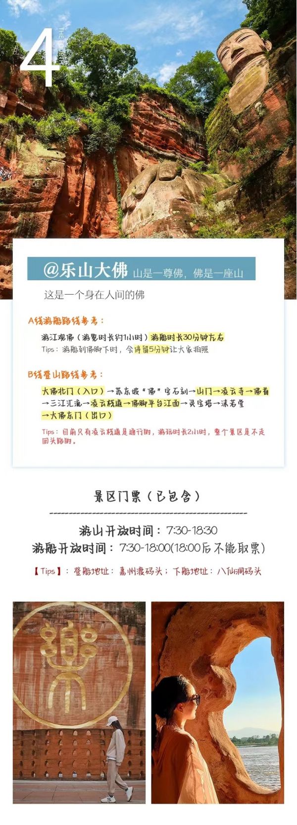 用午餐,品嘗世界非物質文化遺產-翹腳牛肉或峨眉地道九大碗(根據實際情況2選1安排),步行約15分鐘至迎春橋,乘坐旅游車來到樂山。深度登山游覽樂山大佛景區(參觀約3小時)步行333個臺階到達山頂,觀賞世界第一大彌勒坐佛-樂山大佛、凌云寺、九曲摘道、大雄寶殿、靈寶塔,在瞻仰樂山大佛宏偉氣勢的同時,體驗”蜀道難、難于上青天的感覺”,抱千年佛腳后,游漫山的石刻佛像、凌云寺、靈寶塔從東門下山返回到停車場。也可以選擇樂山大佛游船活動哦~看樂山大佛湖面全景。