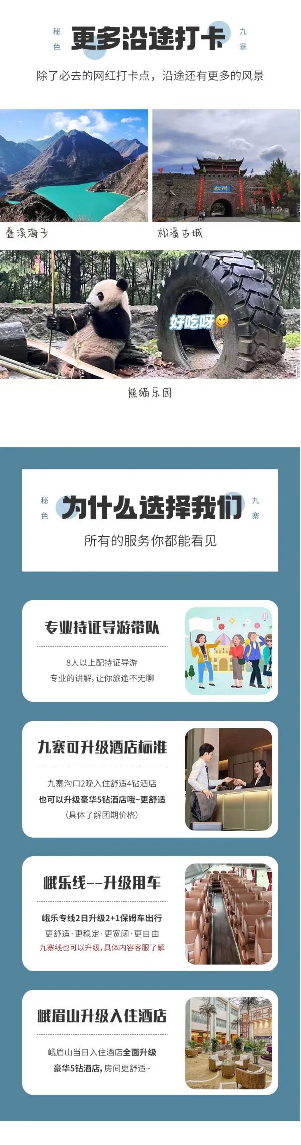 (2)九寨溝面積較大游客需求不一,因此主要以游客自助游形式游覽,如無領隊陪同望您諒解。游覽開始前領隊會與您約定好集合時間,請務必按時到達指定地點,避免耽誤大家接下來的行程;