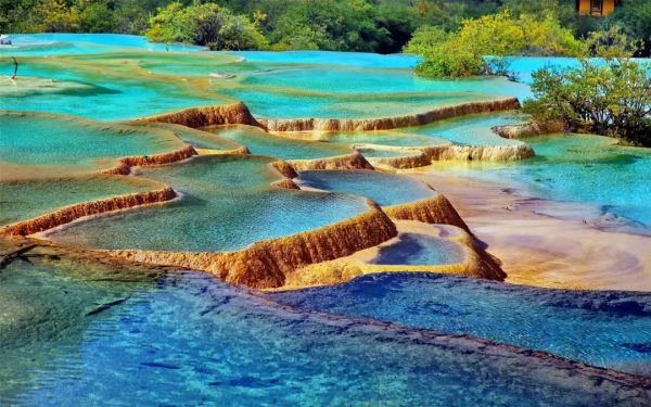 【黃龍風景區】。黃龍風景區擁有獨特的景觀、原始的生態和豐富的資源,其鈣化景觀非常壯觀,鈣化邊石壩彩池、鈣化灘、鈣化扇、鈣化湖、鈣化塌陷湖、坑,以及鈣化瀑布、鈣化洞穴、鈣化泉、鈣化臺、鈣化盆景等一應俱全,堪稱人間仙境。主景區黃龍溝位于岷山主峰雪寶頂下,面臨涪江源流,似中國人心目中"龍"的形象,因而歷來被喻為"中華象征"。