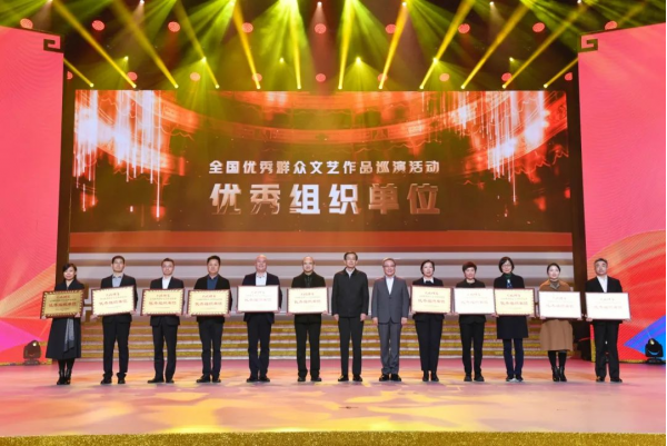 文化和旅游部黨組成員、副部長饒權,北京市副市長劉宇輝出席活動、致辭,并為全國11家巡演組織單位頒發獎牌,山東省文化和旅游廳榮獲優秀組織單位。本次匯演是全國巡演的收官之站,來自全國13個省區市的優秀群眾文藝作品集中亮相,山東兩夾弦小戲《公雞過壽》、陜西表演唱《歌從黃河岸邊邊來》、北京舞蹈《兩室一廳》等第十九屆群星獎獲獎作品,以及廣場舞《歡騰的鄂爾多斯》、街舞《紅星閃閃》等新創作的作品悉數登臺,星光璀璨。“大地情深”全國優秀群眾文藝作品。