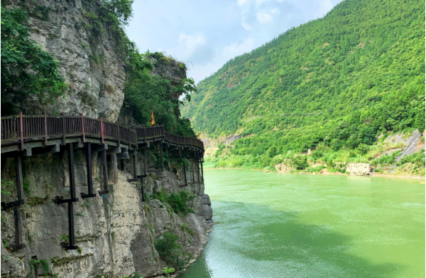 早餐后我們乘車前往明月峽約40分鐘,景區(qū)位于四川廣元嘉陵江西陵峽東段,因峽兩岸的山巖多呈銀白色,并和青峰、江水相輝映,使整個(gè)峽江好像鍍上了一層朦朧的月光,因此得名。峽中多奇峰怪石:有山勢(shì)嵯峨半插天的天柱峰,有宏麗幽深的黃顙洞,有茶圣陸羽稱之為“天下第四泉”的蛤蟆碚,有騰空飛架的仙人橋,有裁云剪霧的青峰“三把刀”。