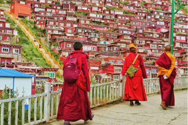 ? 震撼的佛國畫卷逐漸展開--入目處盡是朱紅的佛色,裹著紅袍的僧人在其間穿行,空氣里彌漫著佛香。在金紅相間的佛學院漫步,學著僧人面目虔誠地轉經、朝拜,在觸動轉經筒的旋轉中,感受“信仰”的具象化。