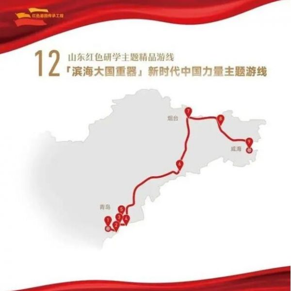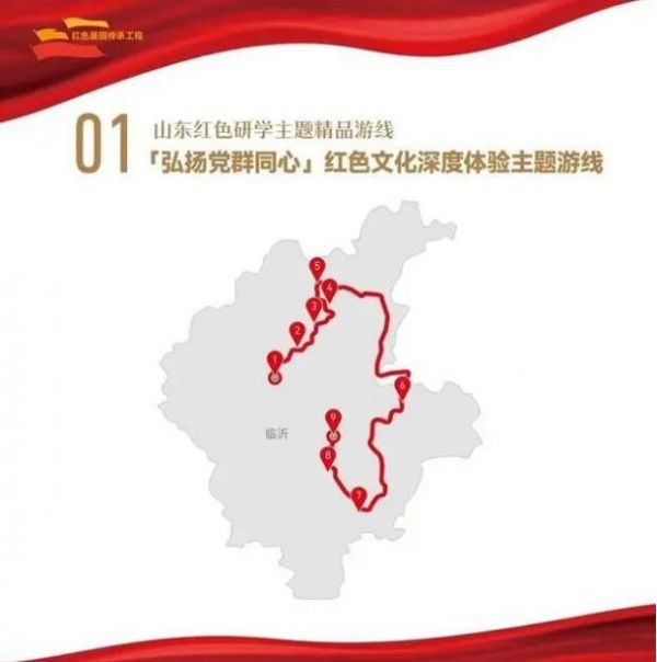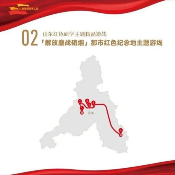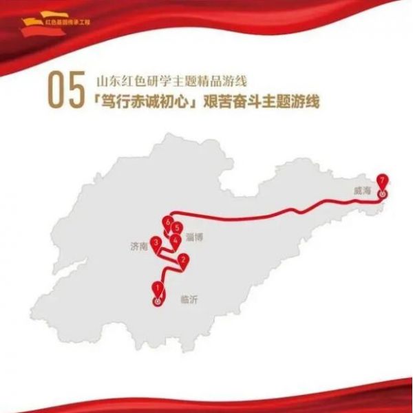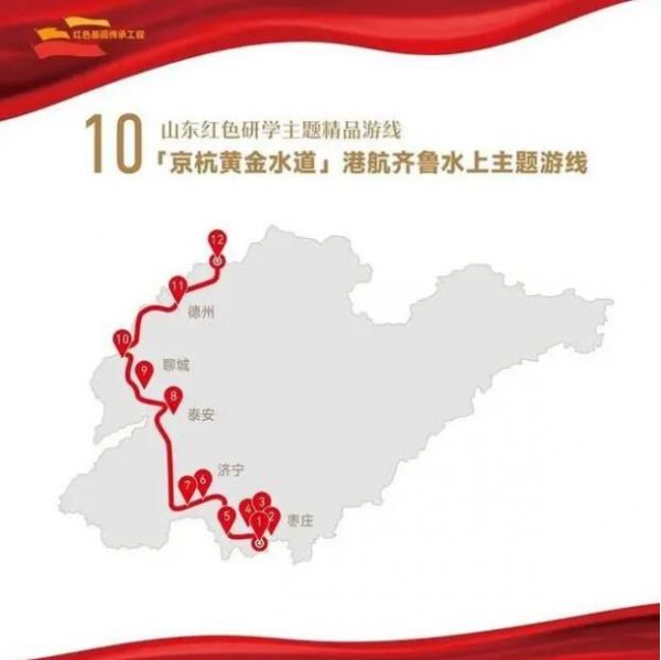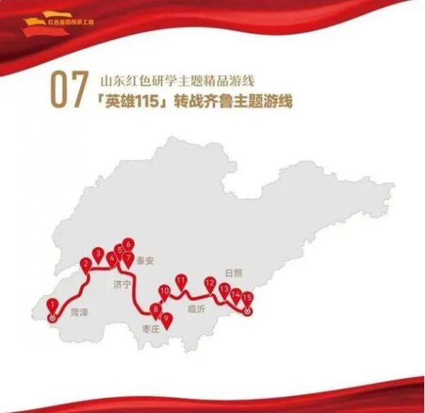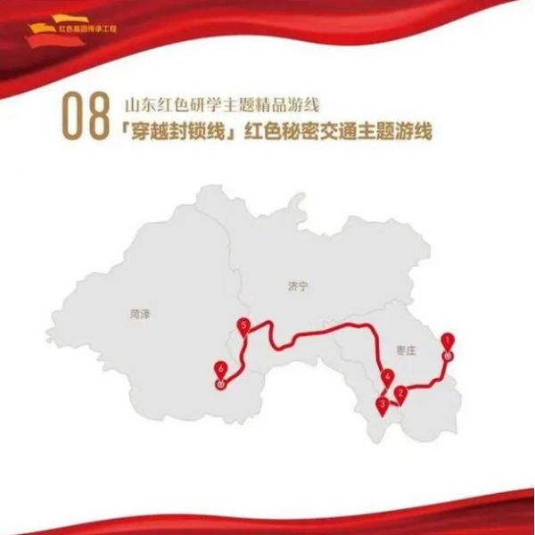 1. 菏澤市湖西人民會議廳舊址——2.濟寧市翟莊黨支部舊址——3.棗莊市滕州微山湖紅荷濕地景區——4.棗莊市津浦鐵路臨城站舊址——5.濟寧市微山湖旅游區——6.濟寧市微山縣劉少奇過湖處遺址——7.煙臺市招遠羅山黃金生態旅游區