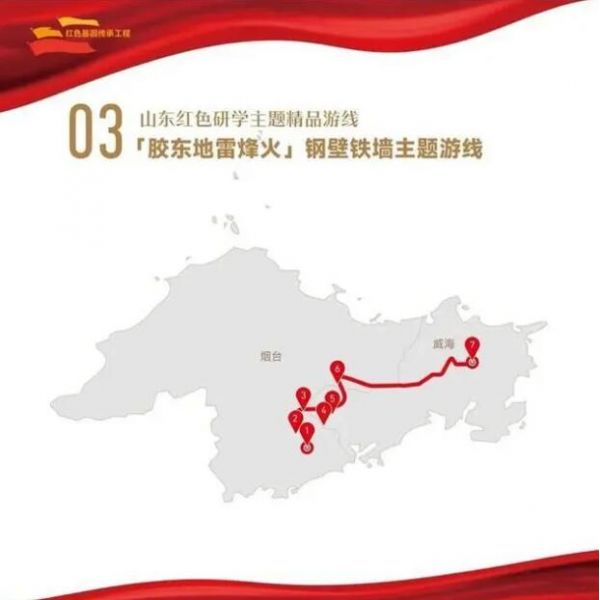 1. 煙臺市地雷戰旅游景區——2.煙臺市海陽地雷戰紀念館——3.煙臺市八路軍膠東軍區機關舊址——4.威海市馬石山烈士陵園——5.威海市紅色密營(下石硼村)——6.威海市膠東育兒所——7.威海市文登天福山革命遺址