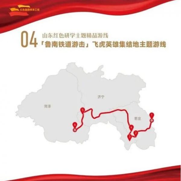 1. 棗莊市八路軍抱犢崮115師紀念園——2.棗莊市白樓灣運河支隊記憶館——3.濟寧市微山湖旅游區——4.棗莊市鐵道游擊隊景區——5.濟寧市魯西南戰役紀念館——6.菏澤市湖西革命烈士陵園
