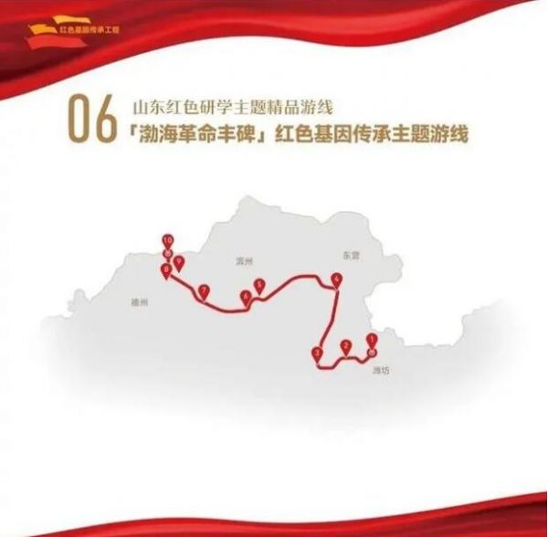 1. 濰坊市大家洼紅色革命研學基地——2.濰坊市壽光牛頭鎮抗日武裝起義陳列館——3.東營市紅色劉集旅游景區——4.東營市渤海墾區革命紀念館——5.濱州市渤海革命老區紀念園——6.濱州市渤海革命老區機關舊址——7.濱州市渤海革命老區兵器博物館——8.德州市冀魯邊區革命紀念園——9.德州市八路軍冀魯邊區抗戰郵局舊址——10.德州市北海銀行冀魯邊區分行舊址
