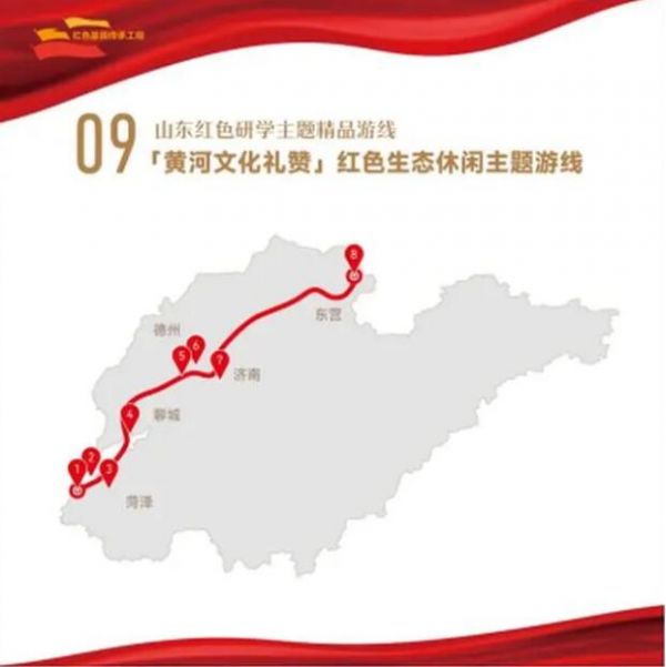 1. 菏澤市冀魯豫黃河水利委員會舊址——2.菏澤市高村黃河歷史文化苑(菏澤黃河水利風景區)——3.菏澤市江蘇壩保衛戰遺址——4.聊城市劉鄧大軍強渡黃河戰役紀念園——5.德州市齊河黃河水鄉國家濕地公園——6.德州市齊河時傳祥紀念館——7.濟南市黃河文化展館——8.東營市黃河口生態旅游區