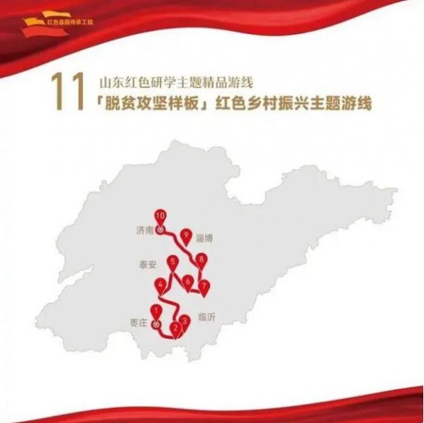 脫貧攻堅偉大斗爭鍛造形成了“上下同心、盡銳出戰、精準務實、開拓創新、攻堅克難、不負人民”的脫貧攻堅精神。在脫貧攻堅戰場上,山東立下脫貧鴻鵠志,齊魯大地換新顏。沿著這條主題游線,您將走進棗莊市山亭區興隆莊村、臨沂市平邑大殿汪村、淄博市中郝峪村等脫貧攻堅典型村落和景點,在山野、在鄉村、在新農人的田間地頭,見證從革命老區到脫貧先進的蛻變歷程,感悟老區人民脫貧攻堅的勤勞和智慧。