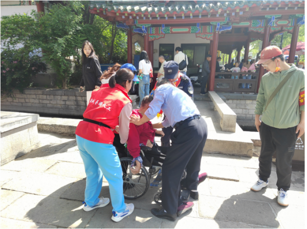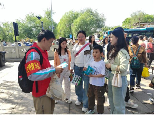 在人流量較大的地點,他們主動協(xié)助景區(qū)維護(hù)游覽秩序和安全,確保游客們能夠安全有序地游覽。同時,他們還向游客們