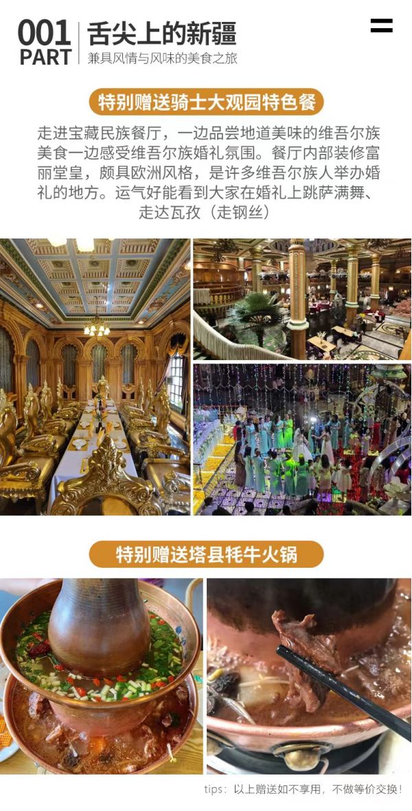 晚上驅(qū)車到達(dá)喀什,今晚大家可以進(jìn)到頗具新疆特色的騎士大觀園餐廳,品嘗新疆特色美食。這個(gè)寶藏民族餐廳,內(nèi)里裝修金碧輝煌,因此很多維吾爾族人會(huì)選擇這里舉行婚禮。如果足夠幸運(yùn),我們可以見證維吾爾族人的婚禮,并欣賞他們?cè)诨槎Y上表演歌舞。