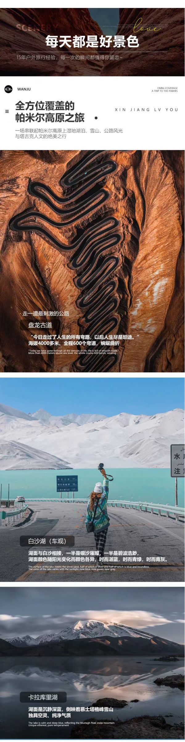 “今日走過了人生的所有彎路,以后人生盡是坦途。”這是出現(xiàn)在新疆帕米爾高原盤龍古道兩頭的宣傳語。繼續(xù)前行,我們會(huì)遇見著名網(wǎng)紅打卡地【盤龍古道】。這條70多公里的馬路,卻有600多個(gè)彎道,海拔最高有4000多,從山頂俯瞰整個(gè)古道,蜿蜒曲折,遠(yuǎn)方還有連綿不斷的雪山,視覺效果十分震撼。