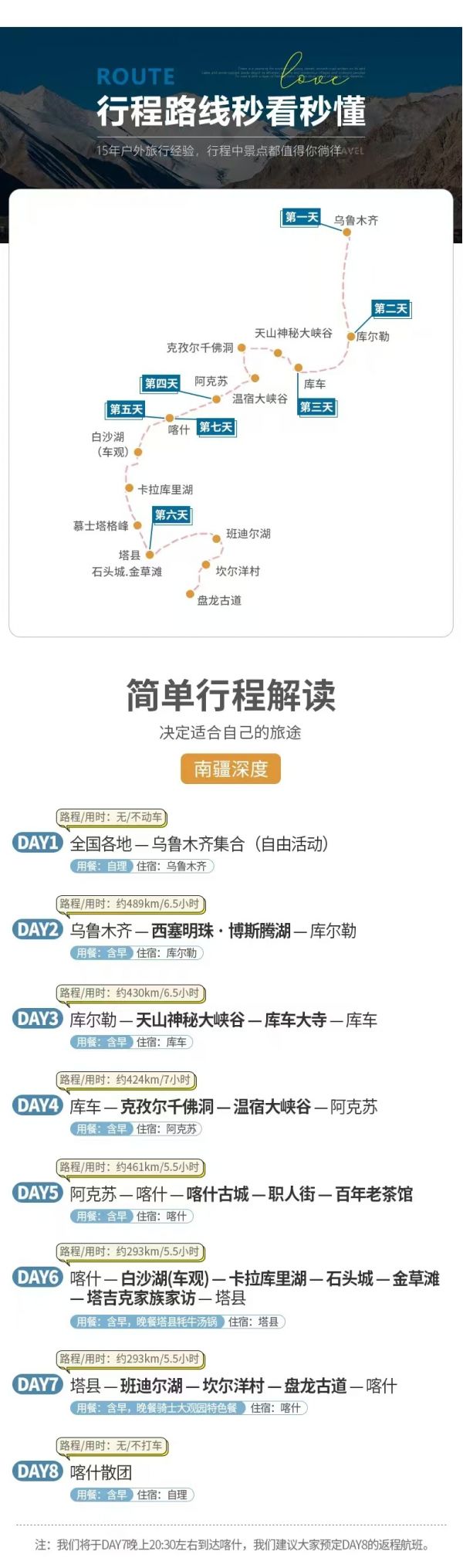 當(dāng)天車程較長,從北疆穿越天山甘溝進(jìn)入南疆腹地,氣候變化較大,請(qǐng)適當(dāng)增減衣物,注意補(bǔ)充水分。可提前購買一些零食,以備不時(shí)之需。