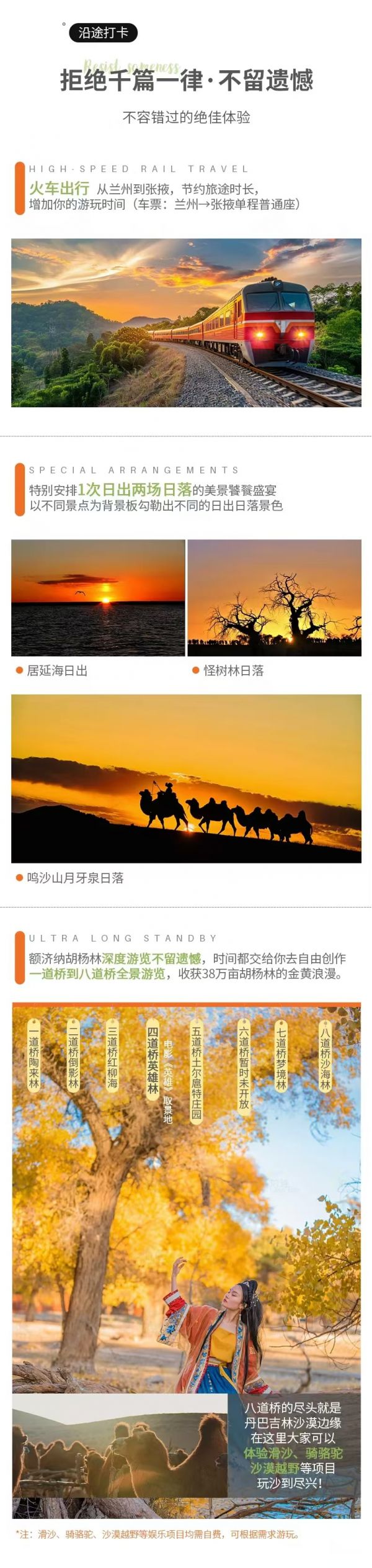 巴丹吉林沙漠自費(fèi)項(xiàng)目(沙漠越野、踏板滑沙、駱駝騎行等),鳴沙山月牙泉景區(qū)自費(fèi)項(xiàng)目(騎駱駝、滑沙、沙漠越野車、沙漠摩托車、滑翔飛機(jī)、直升飛機(jī)等)