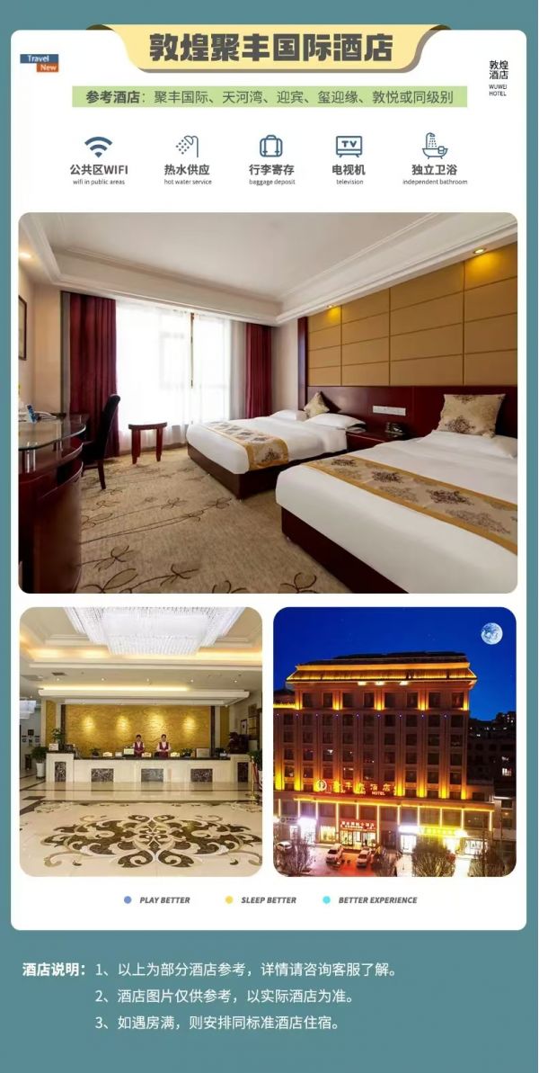 晚上,我們先到酒店辦理入住,放好行李休息片刻后,大家可以在【沙洲夜市】尋覓特色小吃,也可以看一場(chǎng)敦煌沉浸式演出《又見敦煌》(費(fèi)用自理),感受獨(dú)特的敦煌文化,深刻了解和認(rèn)識(shí)敦煌。