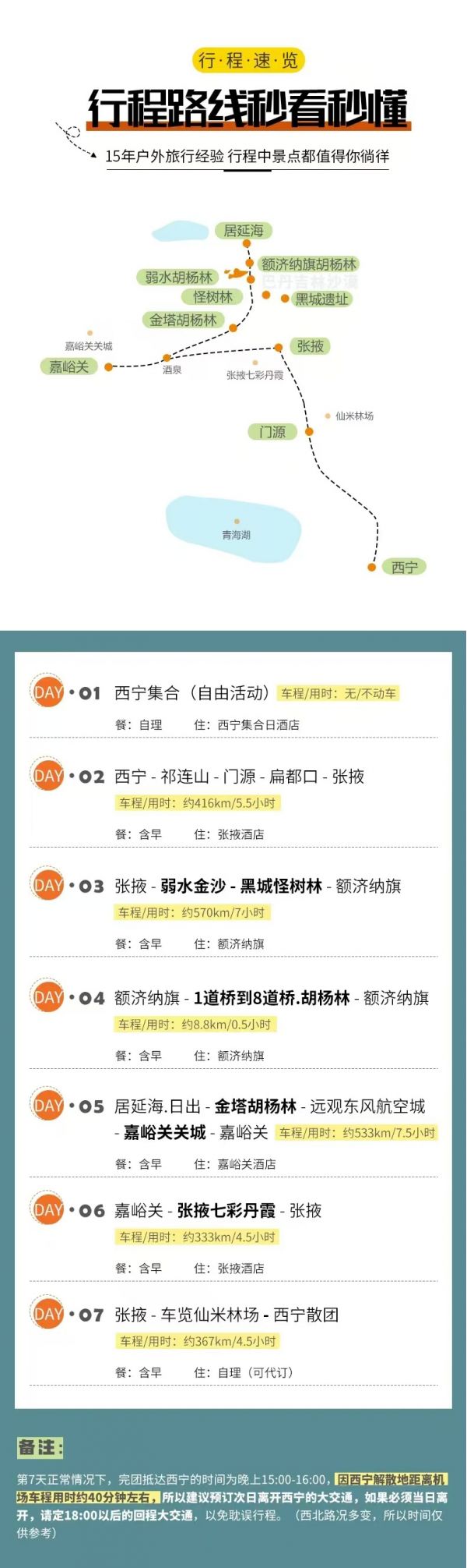 備注請對應使用我方額濟納7日行程,因使用其它行程造成的投訴,責任自負;請仔細閱讀以上行程文檔,同意并保證遵守我方安排,以免為您帶來不必要的麻煩;如產生合同糾紛或人身意外事故,按《中華人民共和國合同法》、《道路交通法》、《保險賠償條例》裁定;本行程作為旅游合同附頁與旅游合同同等法律效力。
