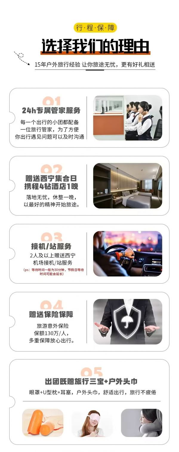接機/站服務:本次活動提供西寧市內24小時接機/接站服務,工作人員會在您出發日期前一天21:30之前向您推送消息并與您聯系,如果超過時間沒有接到任何通知,請及時與報名處聯系。(接站等待時間一般為15-20分鐘,最長不超30分鐘,節假日拼單人數較多情況下客人等待時間可能會延長)。