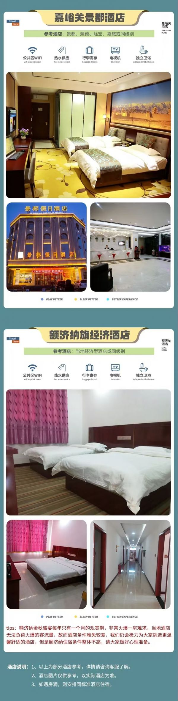 溫馨提示:西北晝夜溫差較大等地域問題,大部分酒店都沒有空調,請提前有心理準備。