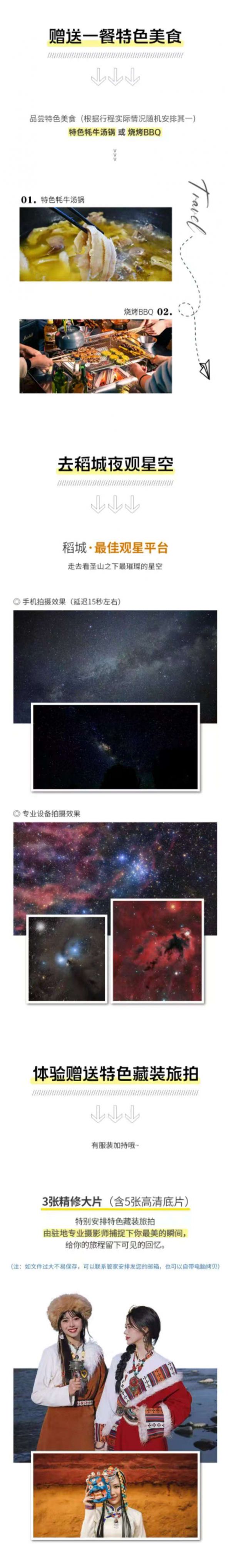 特色亮點:前往稻城最佳觀星平臺(去稻城夜觀星空);因冬季天氣寒冷由11.14日-明年4月取消稻城夜拍星空