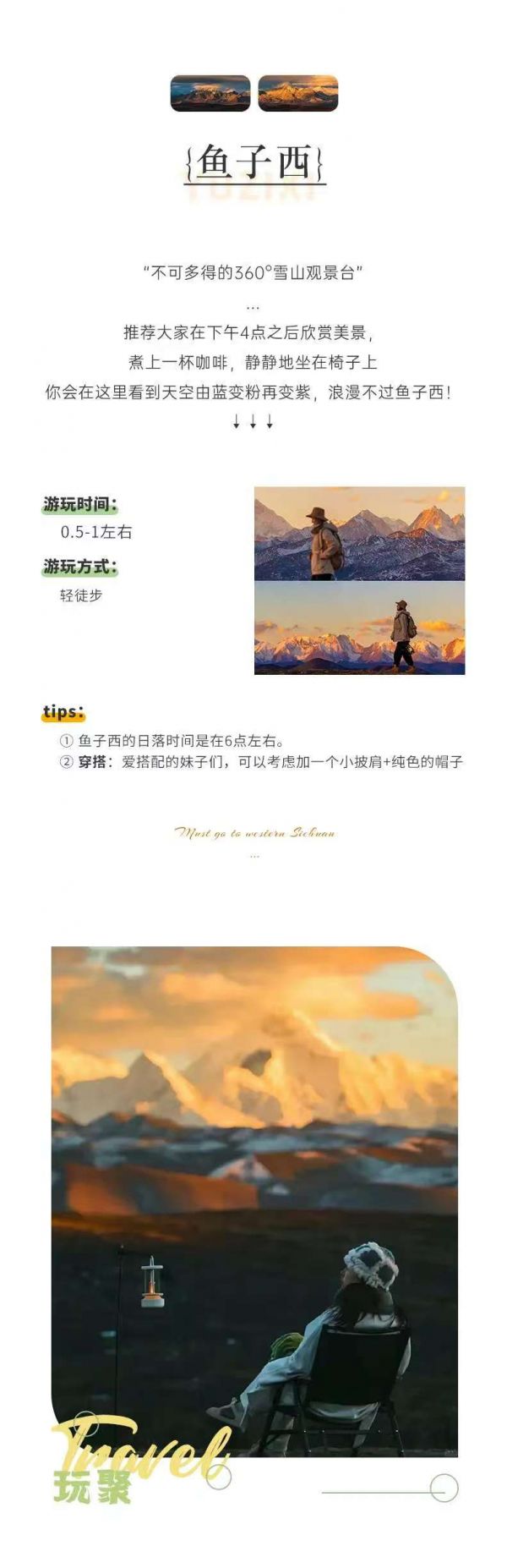 3、在魚子西看日落時,氣溫會比較低,要帶上足夠的保暖衣物。同時,由于海拔較高,要注意預防高反,避免劇烈運動。