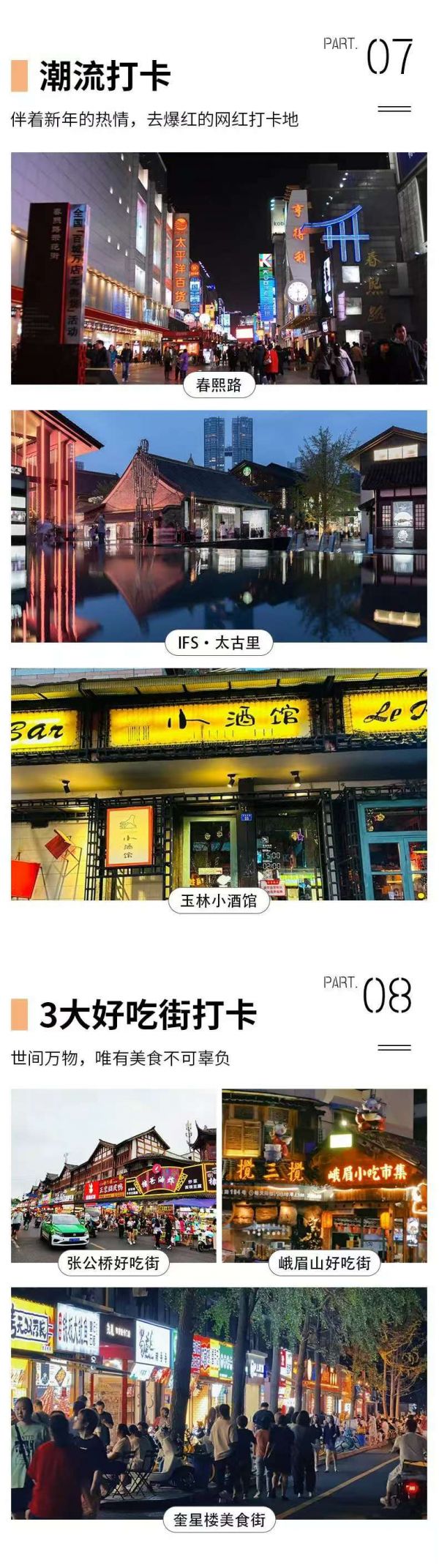 如果時間充裕,您可以自行前往參觀【武侯祠】,去看看成都著名的錦官深處——“紅墻竹影”,也可以去逛逛“新成都的會客廳”【寬窄巷子】,還可以去到【大熊貓繁育研究基地】看望可愛的“滾滾”們,當然最期待的不過是去到古街【錦里】,一邊欣賞著醉人的夜景,一邊嘗著有著成都特色的風味小吃。