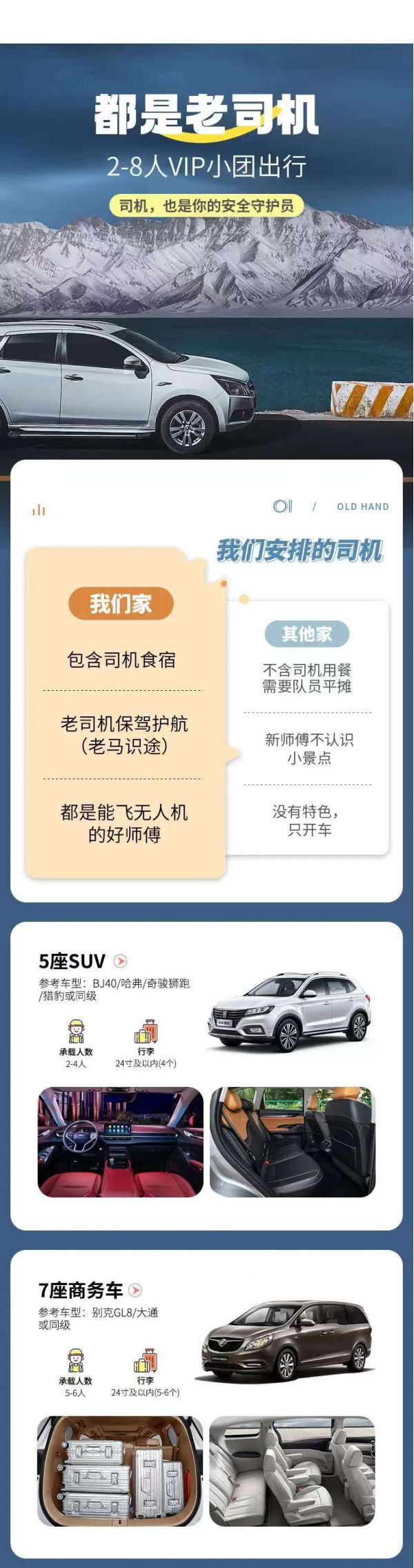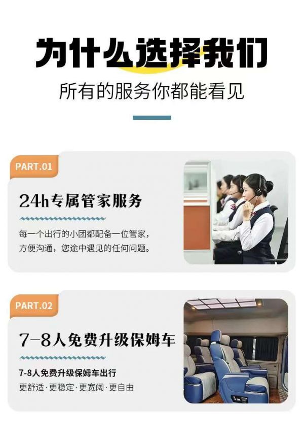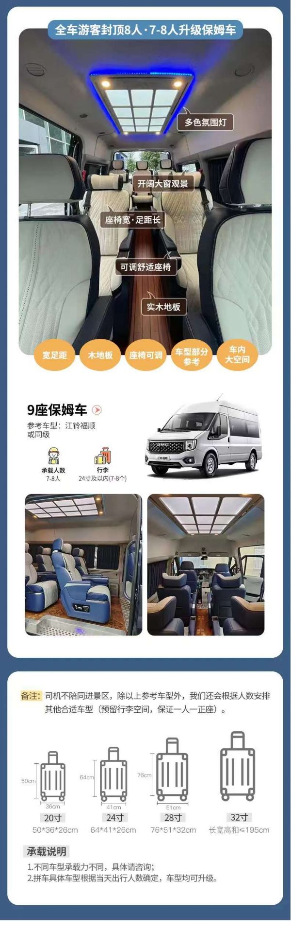 為保證成團及質量,根據人數派不同座位數用車,保證每人一正座;