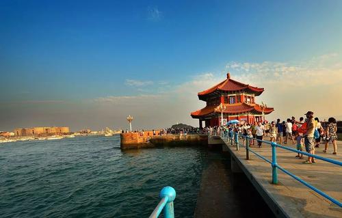 青島棧橋始建于清光緒十八年(1892年),是青島最早的軍事專用人工碼頭建筑,是青島的重要標志性建筑物和著名風景游覽點 。青島棧橋全長440米,寬8米,鋼混結構。橋南端筑半圓形防波堤,堤內建有民族形式的兩層八角樓,名“回瀾閣”,游人佇立閣旁,欣賞層層巨浪涌來,“飛閣回瀾”被譽為“青島十景”之一。