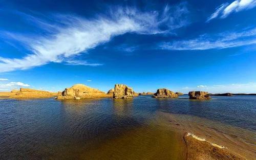 隨后我們來到深居柴達木盆地腹地的【水上雅丹】。這是世界上唯一一處水上雅丹地貌,因其位置較偏僻,即使是當地人也可能不知怎么過去,所以至今仍是一片未開發的處女地,鮮少有人涉足。這立于汪洋之上的雅丹地貌群經過上千年的風雨殘蝕,如同遨游大海顯露脊背的群鯨,湖岸邊高大的鯨背是天然的觀景臺,極目遠望,西邊是高低錯落的水上雅丹地貌群,有的如策馬揚鞭,有的如奔馳的駱駝,有的像婀娜多姿的女子,魔幻而神秘。以清澈透明的藍天為幕,參差錯落的雅丹地貌與碧波交相輝映,天上鴨鳴雁啼,水中波光粼粼,這一望無際的荒漠中憑空而出了一片”汪洋“,只有親身看過這一片汪洋上的鬼斧神工之作,才會明白為它為什么會被人稱為“魔鬼城”。
