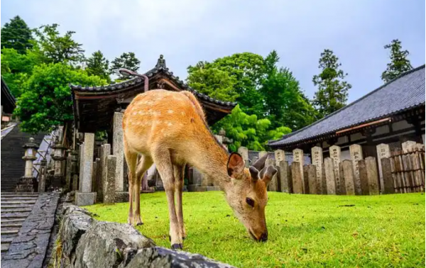 【奈良鹿公園】(約40 分鐘)奈良公園位于奈良東部、春日山腳下,占地面積為 8 平方公里。奈良人深信祖先是騎著鹿而來的,所以對(duì)鹿相當(dāng)崇敬,奈良公園內(nèi)就有 1200 多頭受市政府保護(hù)的野生梅花鹿隨意漫步,游人來到這里也能夠和 它們親密接觸。園內(nèi)到處都有售賣“鹿餅”的攤販,只要游客的手中拿有鹿餅,就會(huì)立刻被許多鹿環(huán)繞其中,感覺非常 奇特。春季嫩枝發(fā)芽櫻花綻放、秋季滿園楓葉的奈良公園都令人心曠神怡,而在其他季節(jié)也很適合悠閑自在地漫步。