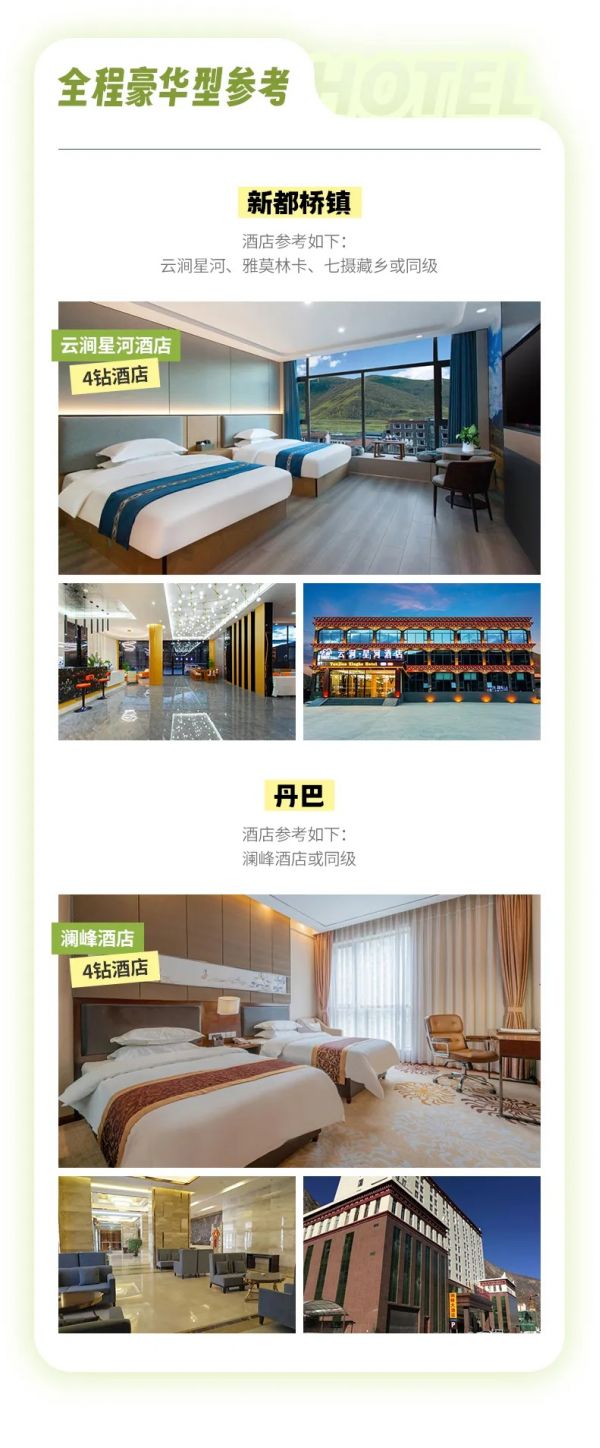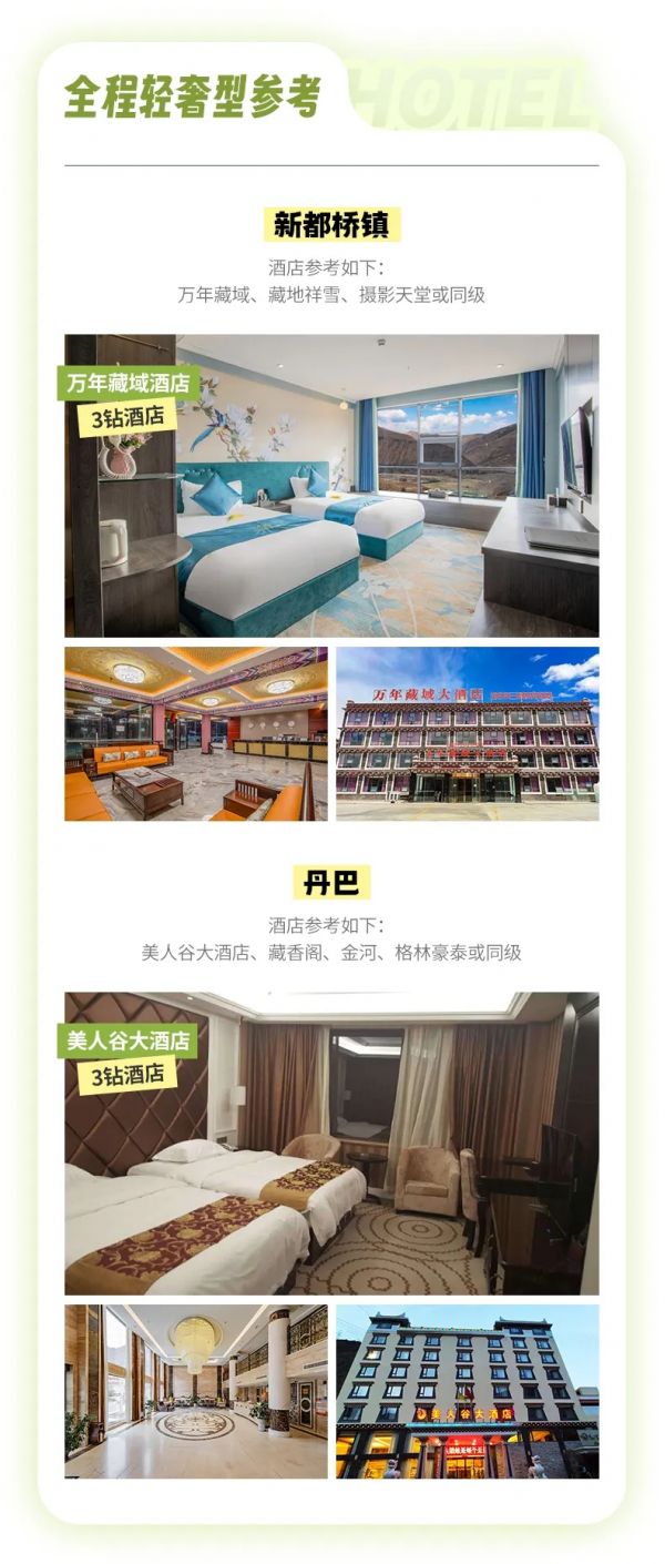 住宿:行程所列住宿地3晚住宿(輕奢型和豪華型酒店任選其一,具體價格詳情查看團期價格或咨詢客服了解詳情),每人1床位(含成都集合日4鉆酒店1晚、不住不退不換不指定)具體了解團期價格。