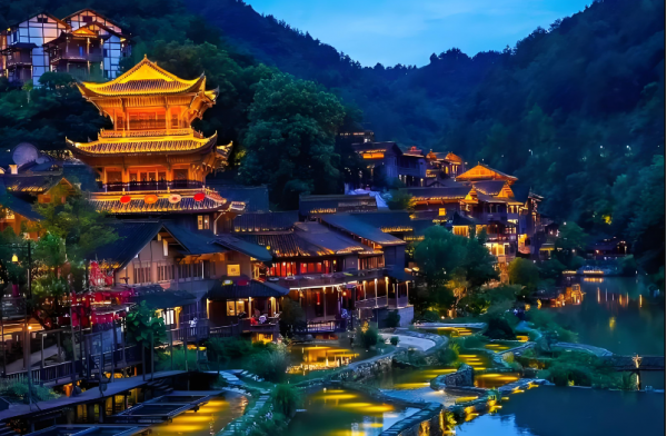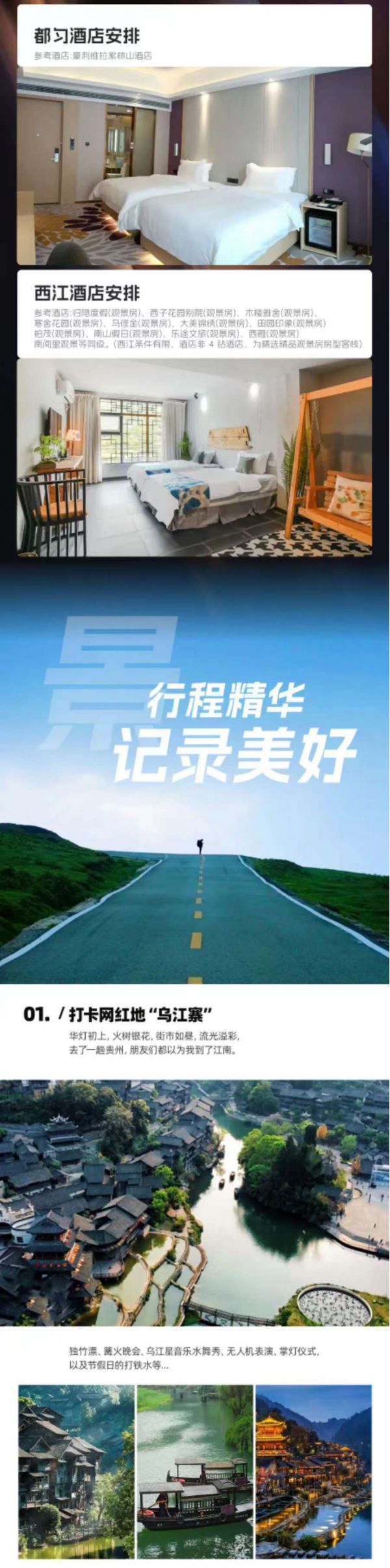 下午:午餐后乘車前往【烏江寨】國際旅游度假區(qū),車程約2.5H(景區(qū)電瓶車已包含,不限次數(shù)乘坐),江南千條水,云貴萬重山,一灣烏江碧水飄落在山間,如黛青山擁簇著烏江寨,兩岸吊腳樓錯落有致,滿滿的黔北風(fēng)情,宛若治愈力拉滿的世外桃源,青山、綠水、吊腳樓、青磚黛瓦、民居、民俗、水舞秀...描繪出一幅黔北民居群落的壯美畫卷,在太乙閣碼頭坐上一艘搖櫓船,穿行在氤氳水汽之間,鱗次櫛比的吊腳樓撲面而來,斜倚船頭,坐看云煙升騰,晨光下的美景猶如一幅水墨畫在眼前暈染開來。景區(qū)是集觀光、休閑、度假、康養(yǎng)、會展為一體的大型綜合業(yè)態(tài)的旅游目的地。景區(qū)內(nèi)辦理入住酒店后自由游覽,晚上景區(qū)內(nèi)可以欣賞震撼壯觀的水舞秀、燈光秀、獨竹飄,無人機編隊表演等。