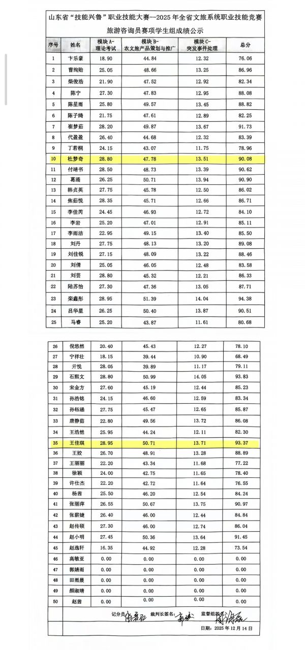 12月14日,2025年山東省“技能興魯”職業(yè)技能大賽全省文旅系統(tǒng)旅行社咨詢(xún)員賽項(xiàng)順利收官,聊城職業(yè)技術(shù)學(xué)院學(xué)生表現(xiàn)亮眼,佳績(jī)的背后,離不開(kāi)劉寶平老師和李雁老師的悉心點(diǎn)撥與傾囊相授,從賽事要點(diǎn)拆解到實(shí)戰(zhàn)模擬演練,他們始終與選手并肩前行。聊城職業(yè)技術(shù)學(xué)院文旅學(xué)子杜夢(mèng)奇和王佳琪出征賽場(chǎng),以專(zhuān)業(yè)為刃、以匠心為鋒,在全省200余支隊(duì)伍的激烈角逐中突圍,將一等獎(jiǎng)、二等獎(jiǎng)收入囊中,盡顯青春風(fēng)采。