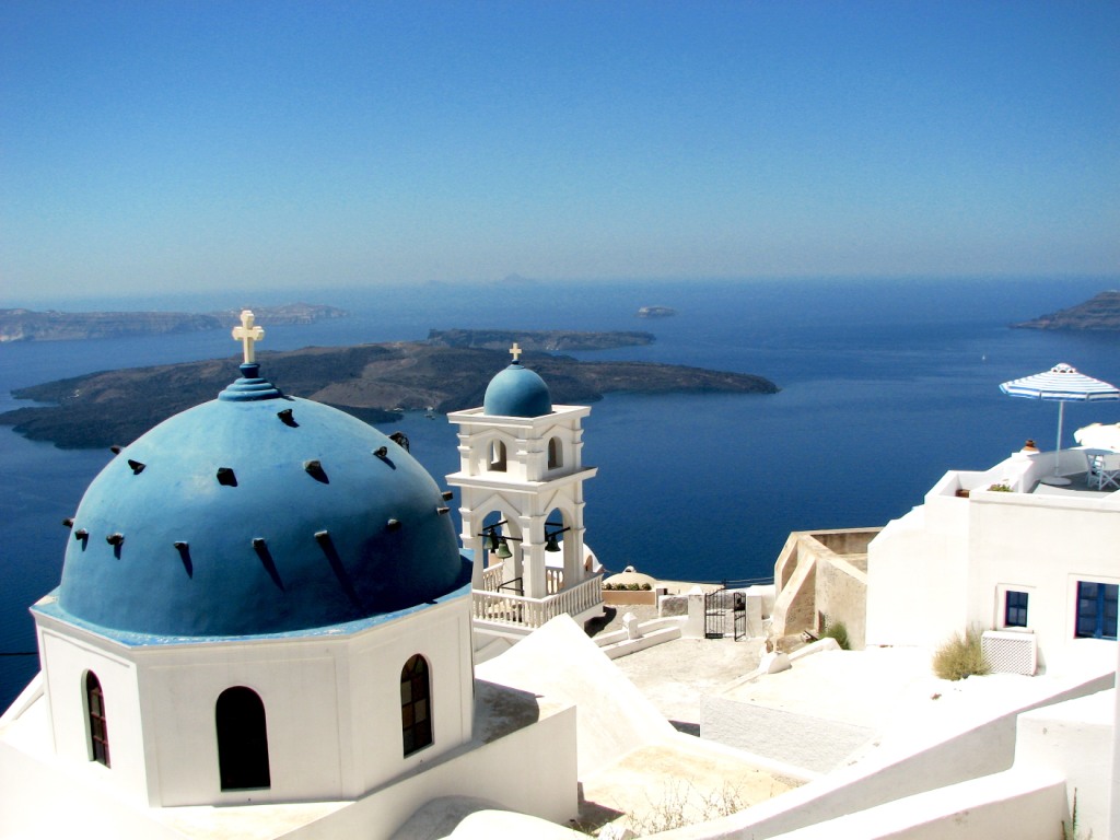 從米克諾斯島乘船到圣特里尼島約需5小時航程。來到以后,才知道很多觀光手冊和旅行社都把米克諾斯島和圣特里尼島作為推薦給游客的首選,是不無道理的。我們的油輪剛靠岸,大家就驚奇地發覺,海邊陡峭的山崖呈紅褐色,山崖的頂端是一片白色的房屋,小巧明麗。據說,該島位于世界兩大大陸板塊最深的海溝之間,原來是圓形的。3500年之前的一次火山爆發,島嶼被震出一個大洞,一大塊月牙形的就成了主島,周圍還有幾個小島,其中一個小島納亞卡美尼至今還是活火山。