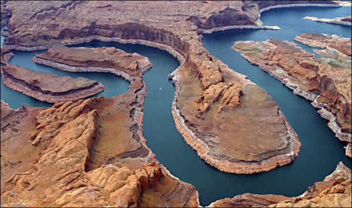 鮑威爾(POWELL)湖是為紀念那位第一個漂流此河并建議開發水利的先驅而命名的。它的面積是米德湖的兩倍多,有各種紅色砂巖、石拱、峽谷和萬面碧波,其風景遠勝米德湖,已成為美國西南部的主要國家度假區。
